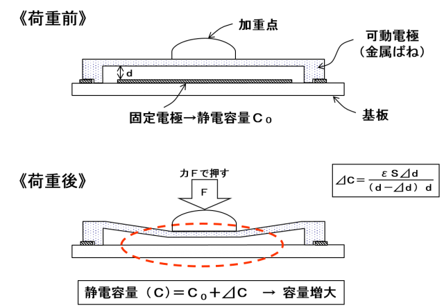 加重点を押すことで変位する、可動電極と固定電極の距離による静電容量の変化を荷重に換算しデジタル信号に変換して出力します。